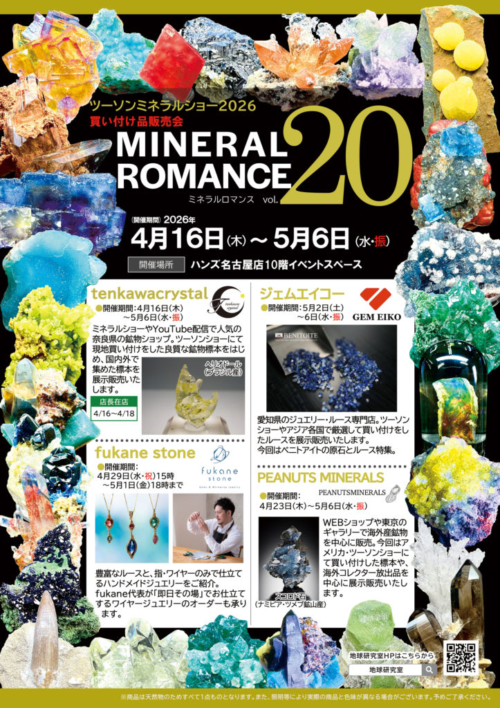 4月16日(木)より、ツーソンミネラルショー2026買い付け品販売会、MINERAL ROMANCE vol.20を開催いたします。